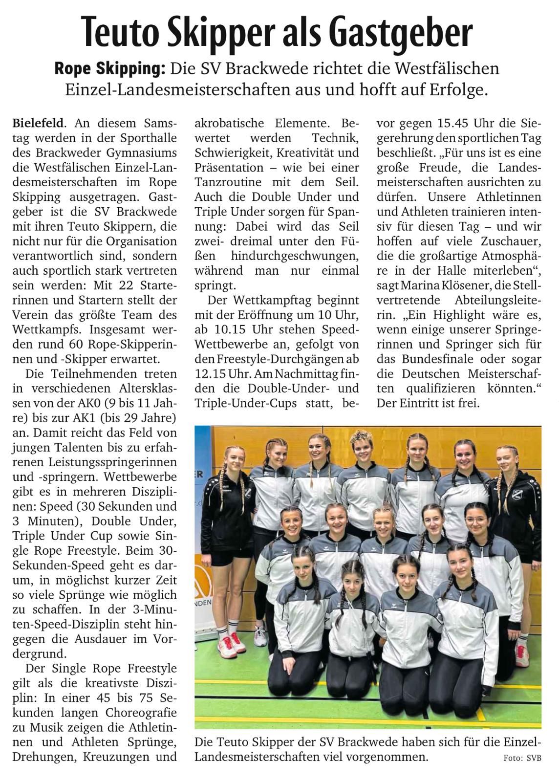 ***Update (23.03.2024): Am 09.03.2024 nahmen die Teuto Skipper der SV Brackwede mit 13 Springerinnen bei den Team-Landesmeisterschaften in Lüneburg teil. Klara Tepaße, Greta Wattenberg, Ela Adigüzel, Malika Lhaoni und Hayat Korkmaz sprangen das erste Mal einen Teamwettkampf und konnten mit fast fehlerfreien Freestyles und guten Speedwerten sehr zufrieden mit sich sein! Das Team um Zoé Swiniartzki, Amelie Urbanczyk, Hanna Ruschke und Selin Mercan trat in 5 Disziplinen an den Start. Auch das Team kann auf ihre Leistungen stolz sein! Melina und Leandra Krause sicherten sich in Lüneburg nachträglich noch die Qualifikation in der Disziplin Single Rope Pair Freestyle für die Deutschen Teammeisterschaften.***